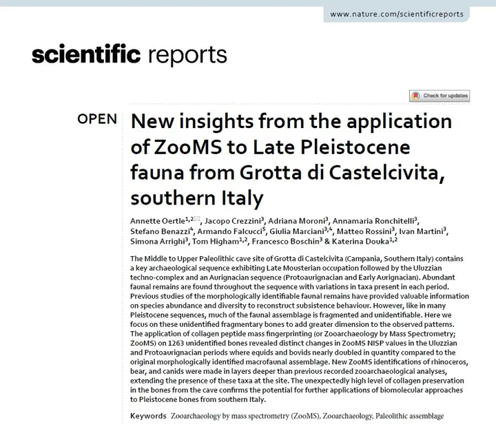 The Middle to Upper Paleolithic cave site of Grotta di Castelcivita (Campania, Southern Italy) contains a key archaeological sequence exhibiting Late Mousterian occupation followed by the Uluzzian techno-complex and an Aurignacian sequence (Protoaurignacian and Early Aurignacian). Abundant faunal remains are found throughout the sequence with variations in taxa present in each period. Previous studies of the morphologically identifiable faunal remains have provided valuable information on species abundance and diversity to reconstruct subsistence behaviour. However, like in many leistocene sequences, much of the faunal assemblage is fragmented and unidentifiable. Here we focus on these unidentified fragmentary bones to add greater dimension to the observed patterns. The application of collagen peptide mass fingerprinting (or Zooarchaeology by Mass Spectrometry; ZooMS) on 1263 unidentified bones revealed distinct changes in ZooMS NISP values in the Uluzzian and Protoaurignacian periods where equids and bovids nearly doubled in quantity compared to the original morphologically identified macrofaunal assemblage. New ZooMS identifications of rhinoceros, bear, and canids were made in layers deeper than previous recorded zooarchaeological analyses, extending the presence of these taxa at the site. The unexpectedly high level of collagen preservation in the bones from the cave confirms the potential for further applications of biomolecular approaches to Pleistocene bones from southern Italy.